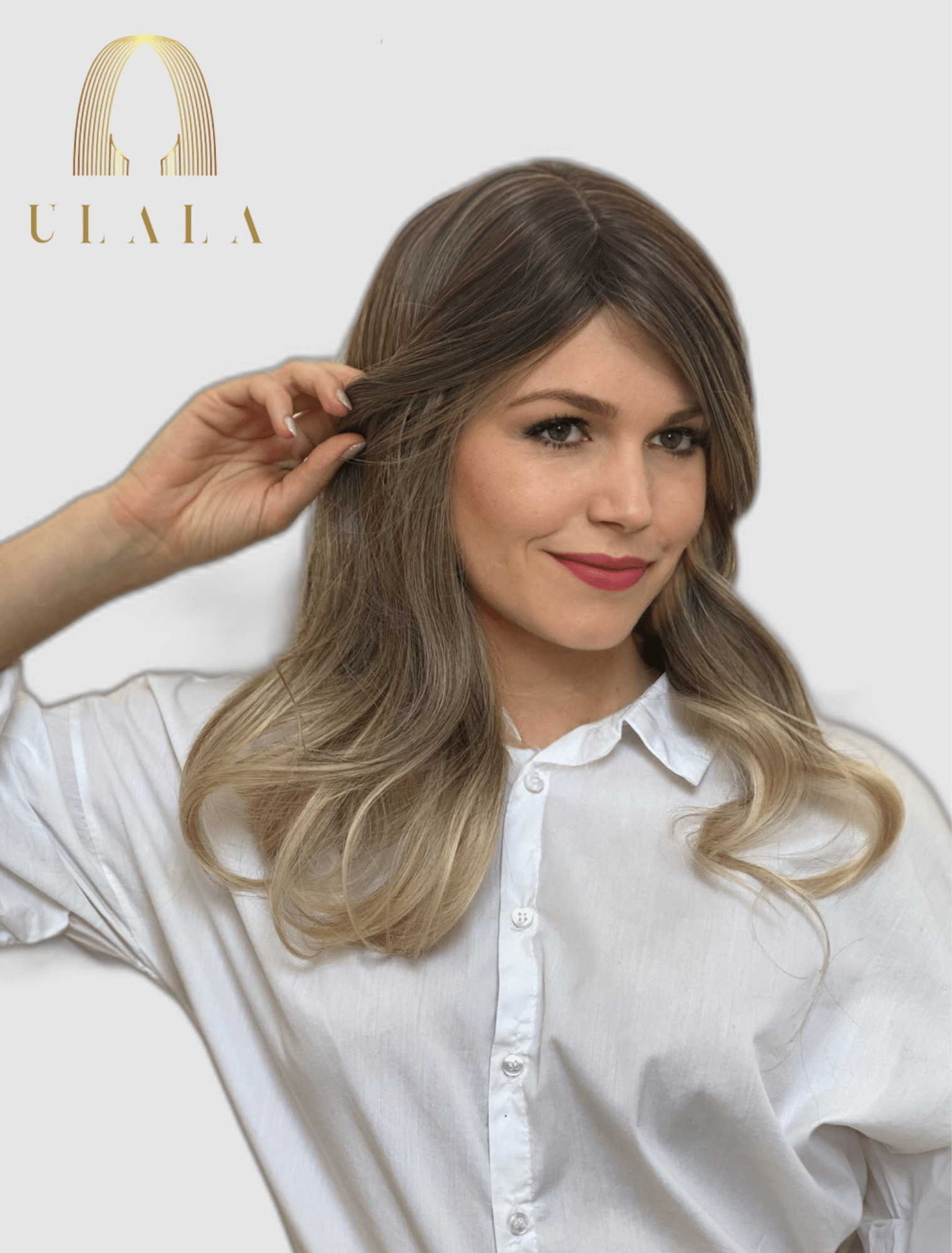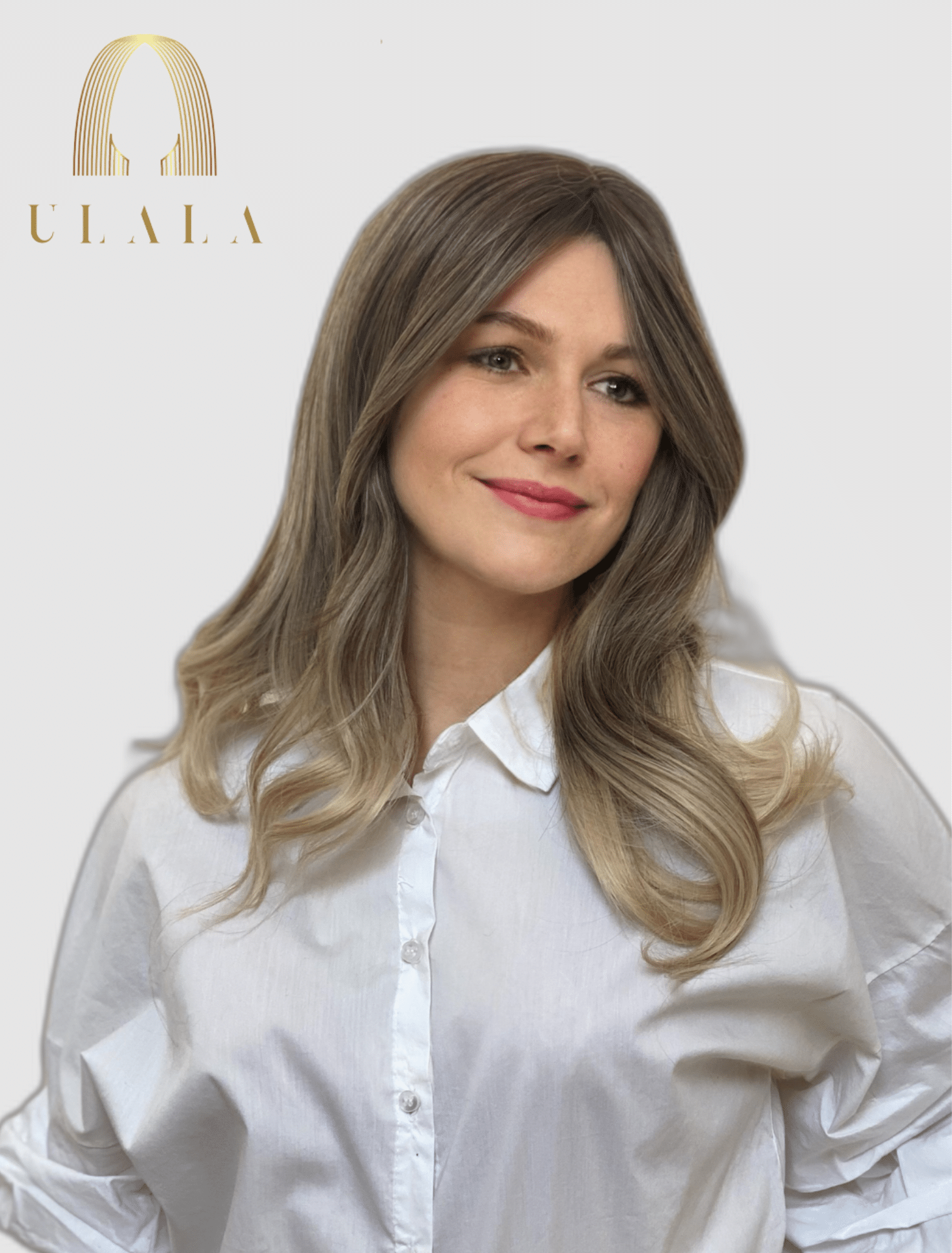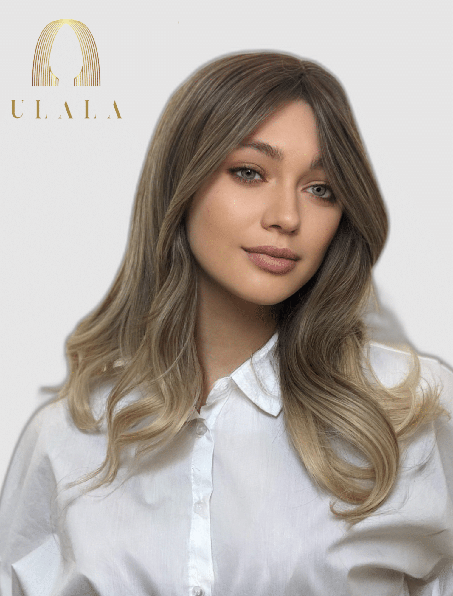 Szín: Sötétszőke balayage – világos hamvasszőke hajvégekkel (akár a képen)